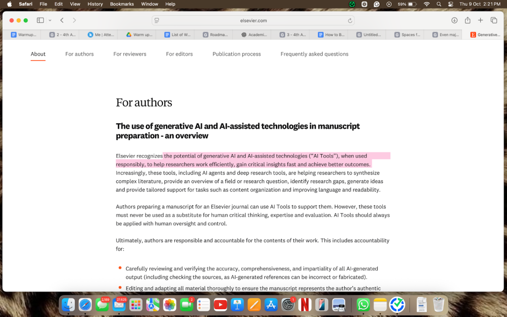 Even major journals like Nature and Elsevier have published guidelines confirming this: you can use AI tools for editing and analysis, just don’t list them as co-authors or submit their text unedited.