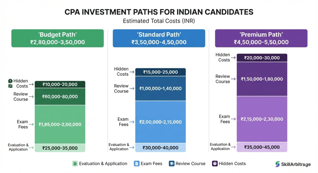 The total cost of becoming a CPA from India ranges from approximately ₹2,80,000 for the budget-conscious candidate to ₹5,50,000 for those investing in premium preparation and support. Most candidates spend between ₹3,50,000 and ₹4,50,000 when accounting for a quality review course, standard fees, and a realistic buffer for unexpected expenses.