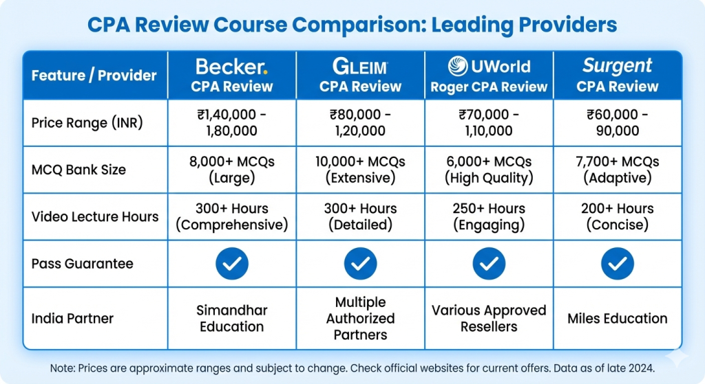 The Indian CPA coaching market is dominated by a few key players who partner with international review course providers. These partnerships give Indian candidates access to world-class study materials along with local support, live classes, and mentorship. Prices vary significantly based on the study materials included, the level of coaching support, and additional services like placement assistance.