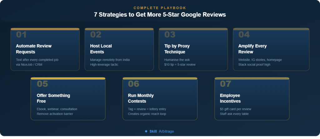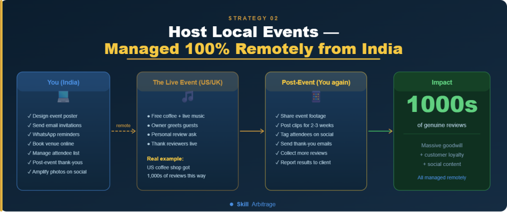 Offline events are one of the highest-leverage review-generation tactics available and you don’t need to be in the same city to run them.