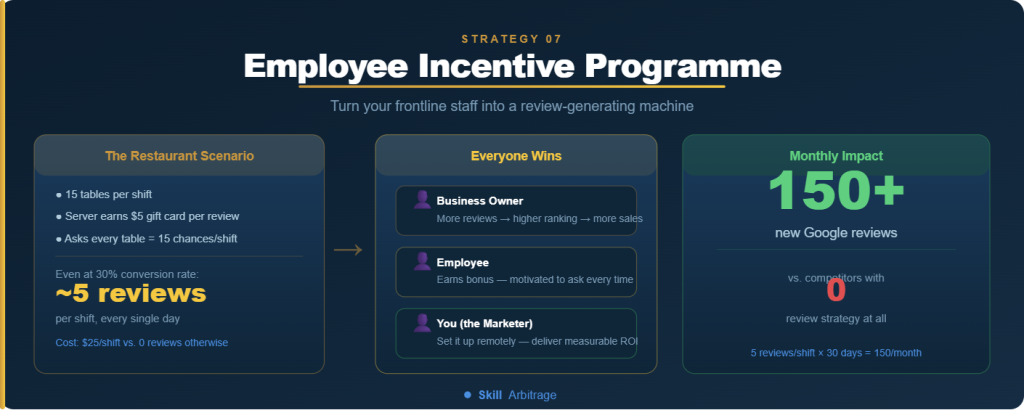 The logic is simple: if a server at a 15-table restaurant gets a $5 gift card per Google review, and they work one shift per day, the math makes them highly motivated to ask every table. Management gets reviews. Employees get a bonus. Everyone wins.