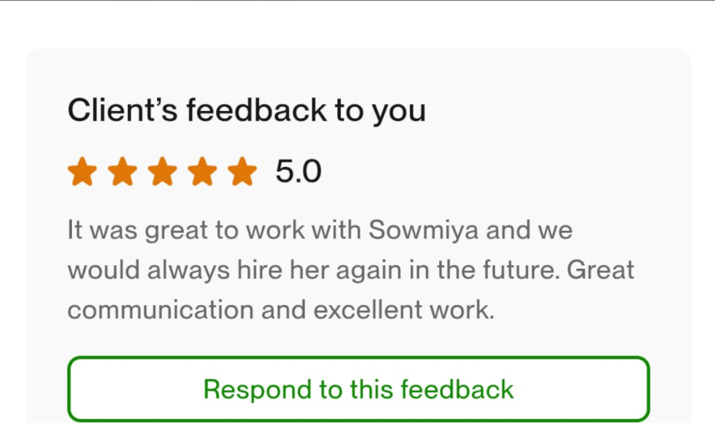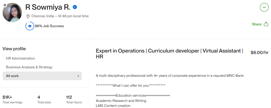 Sowmiya earned INR 20,000 within just a month by showcasing her AI-driven projects. She landed her first freelance job on Upwork as a Tamil & English-speaking Virtual Assistant, earning USD 820 from an Estonia-based client. She expanded her career further, securing multiple freelance jobs and building her income to INR 37,000 per month with two steady clients. Profile