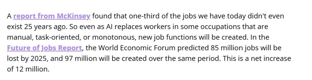 AI is transforming industries, but many still fear that it will take away jobs. However, AI is not closing doors, it’s opening a world of opportunities. According to the World Economic Forum (2023), AI is projected to create 97 million new jobs, while only displacing 85 million. Furthermore, McKinsey predicts that automation will increase global productivity by 1.4% annually, creating more demand for roles involving AI.