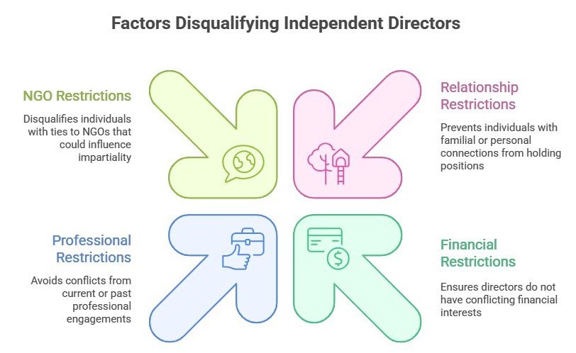 These restrictions ensure that independent directors maintain objective judgment unclouded by financial dependencies or personal relationships.