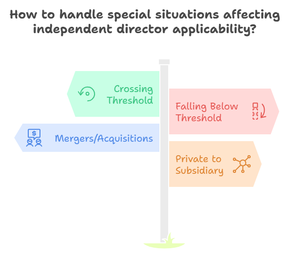 Understanding these edge cases is essential for proactive compliance management, particularly for companies operating near applicability thresholds or planning significant corporate actions that might trigger or eliminate independent director requirements.