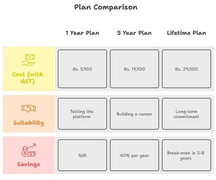 • ₹25,000 + 18% GST (total Rs. 29,500) for lifetime subscription.