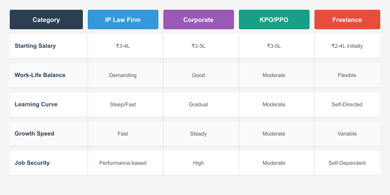 • Chennai, Kolkata, Ahmedabad: Tier-2 IP markets. Fewer opportunities, but also lower cost of living and less competition. Good for work-life balance and starting careers. Can work remotely for Delhi/Mumbai firms while living in these cities.