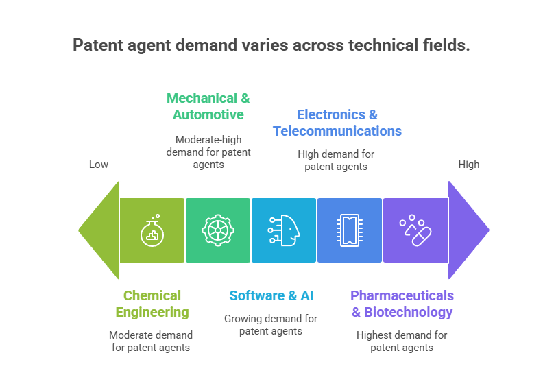 The pharmaceutical and biotech sectors represent the highest-demand areas for patent agents in India. These industries rely heavily on patent protection because R&D investments are enormous; it can take 10-15 years and billions of dollars to develop a single drug. Patent Agents receive particularly handsome remuneration in biotechnology and pharmacy firms, with students having M.Pharm or chemistry backgrounds finding excellent opportunities in pharmaceutical companies.
