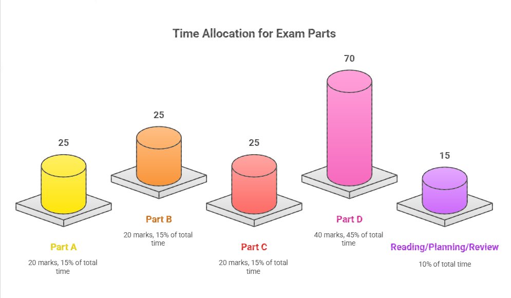 - 45% of the time (70 minutes) for Part D’s 40 marks, with