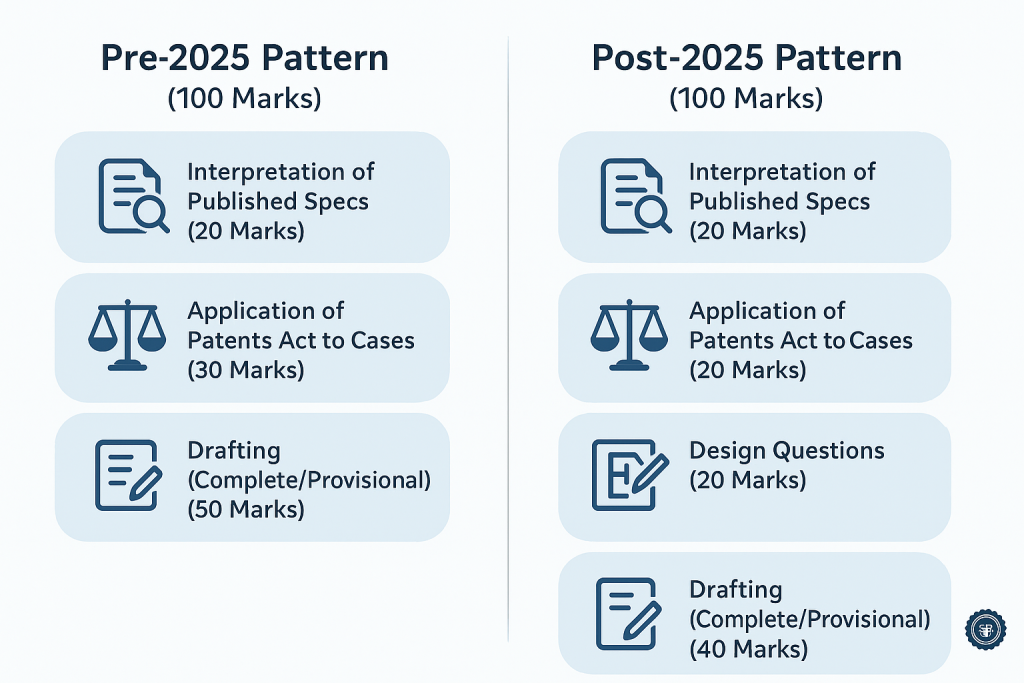 The 2025 examination introduces Design Law as a significant addition to Paper II, marking the most substantial pattern change. Paper II now includes questions on design registration procedures, design interpretation, and Designs Act 2000 provisions alongside traditional patent drafting.