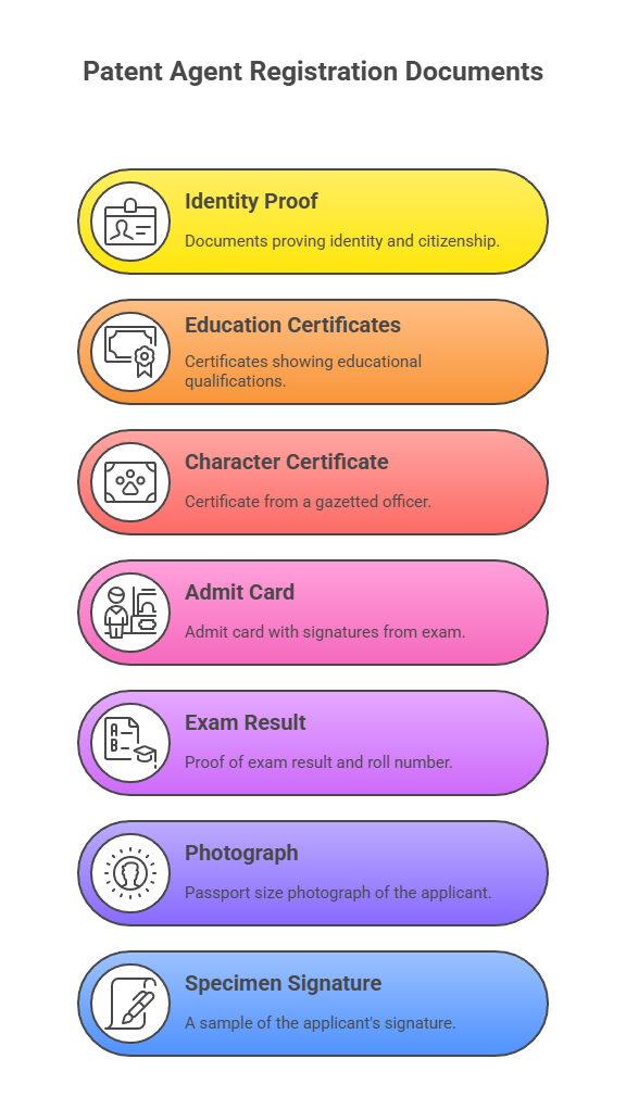 After clearing the Patent Agent Examination, you must submit multiple supporting documents along with Form 22 to the Controller. These documents verify your identity, citizenship, educational qualifications, character, and exam performance. The Controller cross-verifies every document against your application details, so accuracy and completeness are critical.