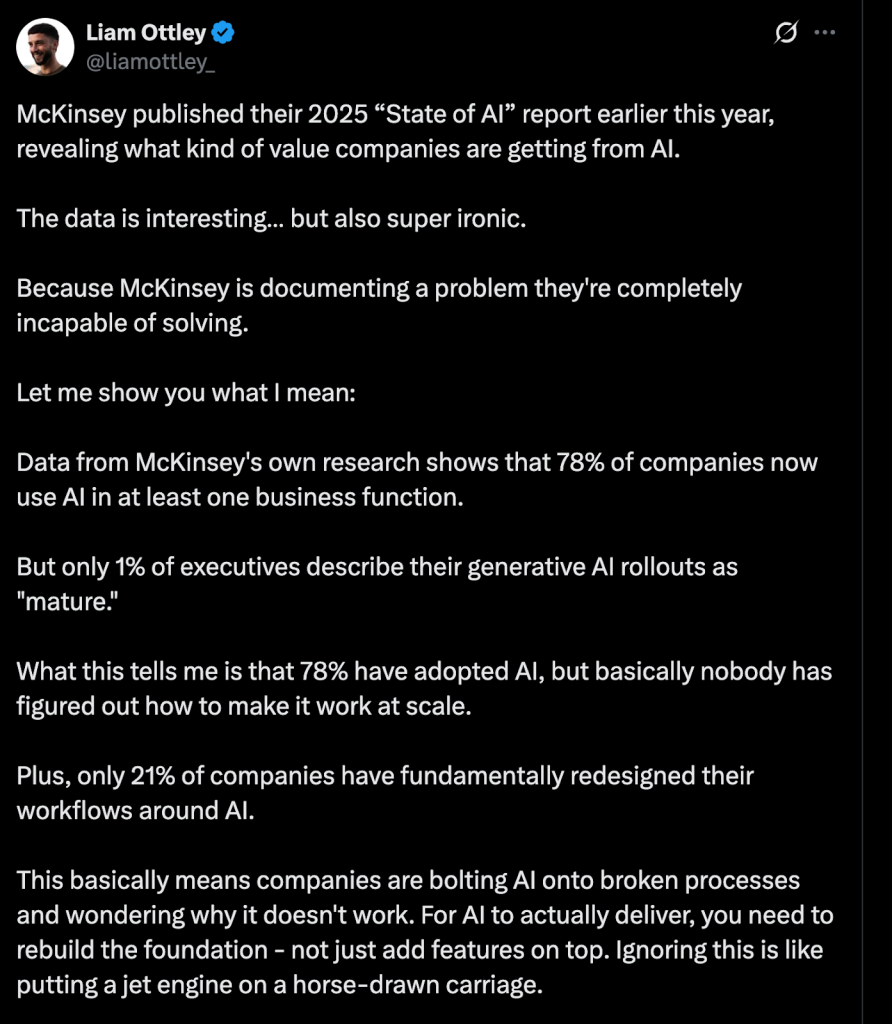 Here’s a number that should stop you in your tracks: 78% of companies are actively trying to implement AI and automation but most have solved less than 1% of their actual problems. The tools exist. The budgets are there. What’s missing is people who know how to build systems that actually work.