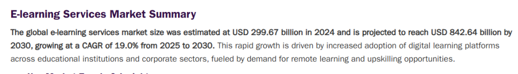 The EdTech sector is booming, with e-learning estimated at ~USD 300 billion (2024) expected to reach USD 843 billion by 2030. Alongside EdTech companies, independent coaches, therapists, and other experts are increasingly outsourcing tasks like content creation, course development, and writing self-help books or articles.