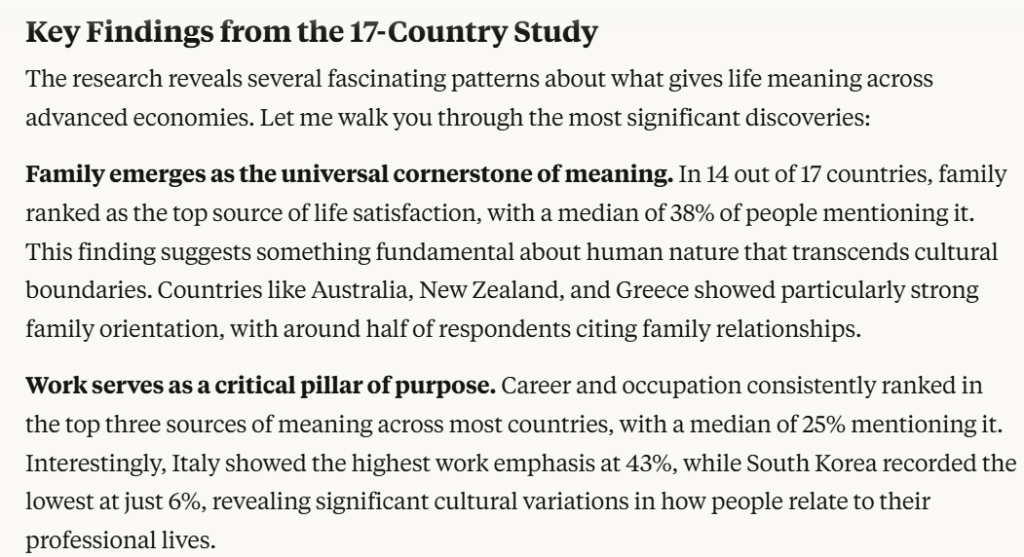 PEW Research Centre published a landmark study asking respondents from 17 advanced countries what makes life meaningful. Their top findings: career success, financial security, personal achievement, and individual freedom.