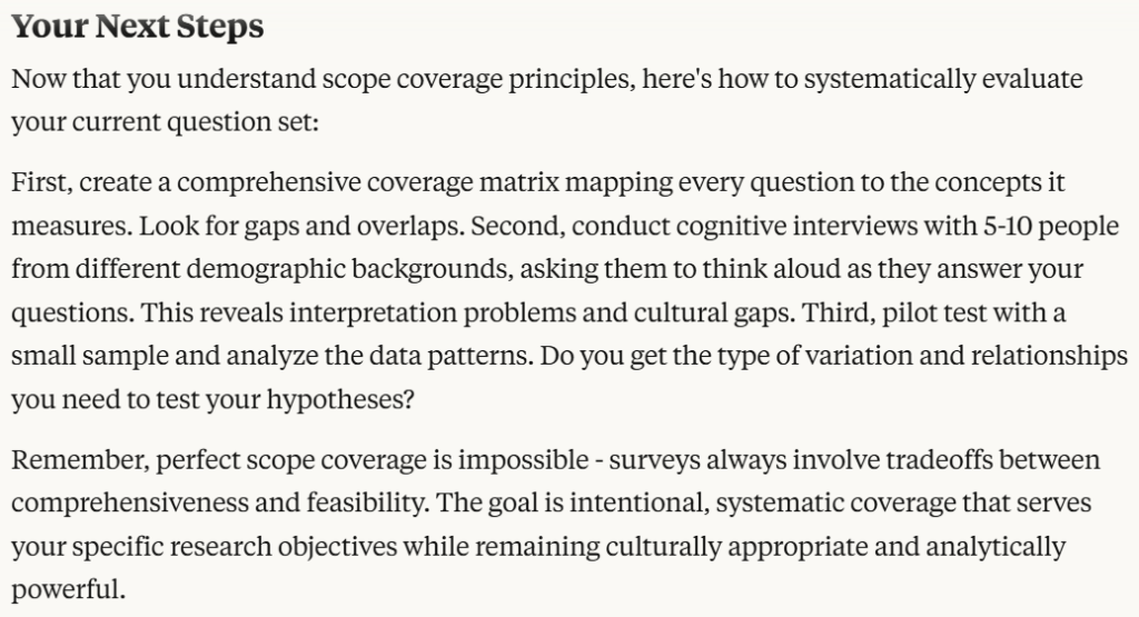 Prompt AI: “I want to test scope coverage for this survey. Identify any major conceptual territories this questionnaire is missing and suggest questions to fill those gaps.”