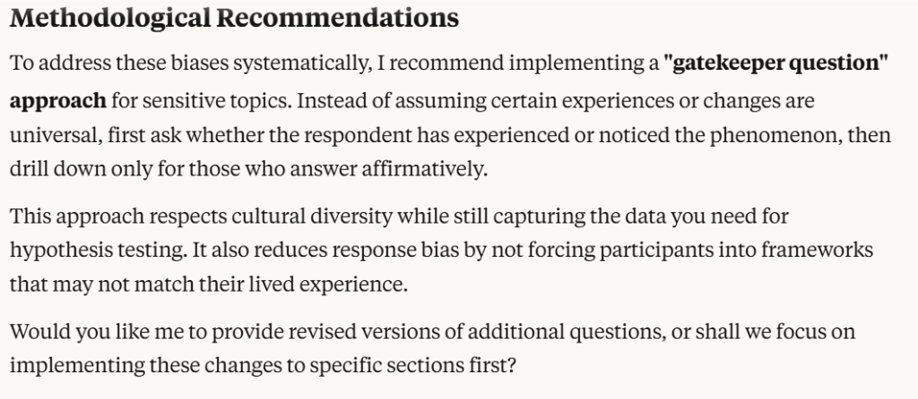 Prompt: “Flag any leading or culturally biased phrasing and suggest neutral alternatives to these questions.”