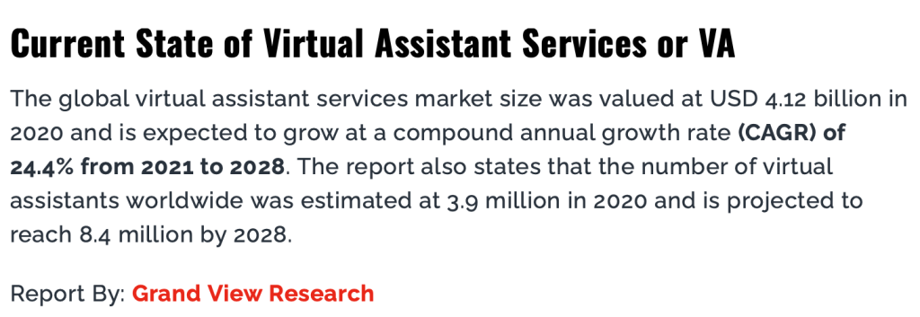 The number of virtual assistants worldwide was estimated at 3.9 million in 2020 and is projected to reach 8.4 million by 2028. If you are an effective entrepreneur in this market, the sky is the limit.