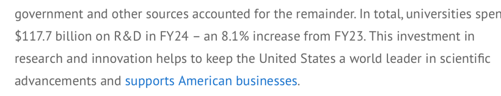 Research funding itself is substantial. For example, U.S. university investment in research reached $117.7 billion in R&D in FY24, representing an 8.1% increase from FY23.(source)