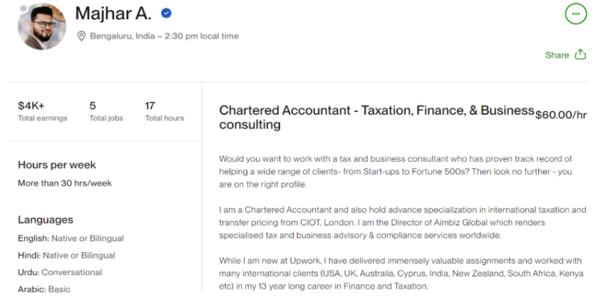 - Majhar Awedin, a B.Com graduate and a qualified CA, has earned over $4000 through Upwork with clients in the US, Australia, and Norway. He has nearly 13 years of experience in finance and taxation, including working at PwC and other MNCs.