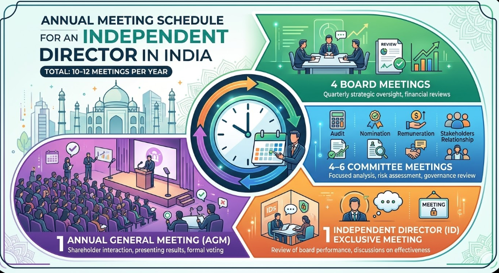 Typically 15 to 20 meetings per year per company, including board meetings, committee meetings, an independent directors’ exclusive meeting, and the AGM. The Companies Act mandates at least four board meetings annually.